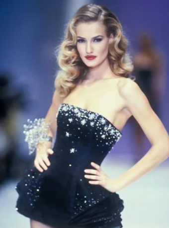 Née aux Pays-Bas, Karen Mulder est repérée très jeune. Sa carrière explose au moment où la mode glorifie une féminité à la fois puissante et inaccessible. Elle incarne parfaitement ce fantasme : froide en apparence, mais troublante.